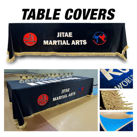 The listing include one Custom Embroidered Premium Velvet Table Cover with a custom embroidered logo no bigger than 23" x 16" and text with no more than 35 characters.