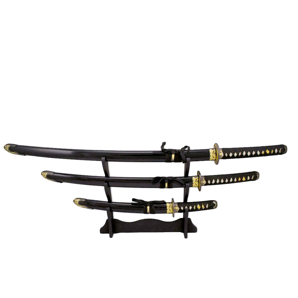 Samurai Sword Set with Display Stand – 3-Piece Black & Gold Deluxe Edition