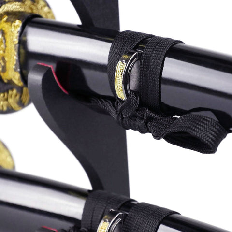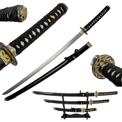 Whether you're a collector, martial arts enthusiast, or simply appreciate samurai craftsmanship, this deluxe black and gold sword set delivers a commanding centerpiece with timeless appeal.