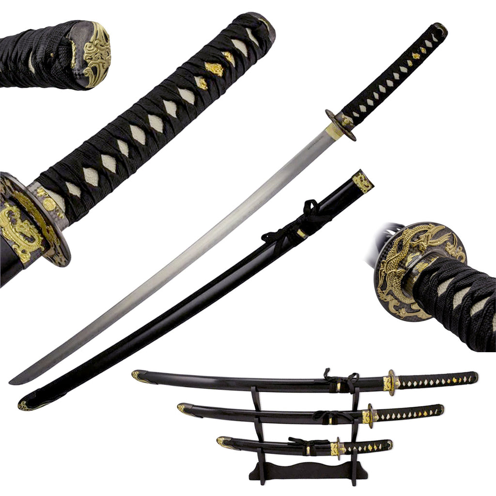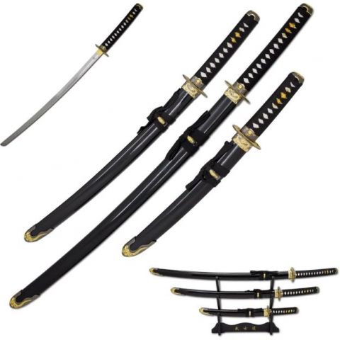 Elevate any collection with this premium 3-piece Samurai Sword Set, complete with a matching display stand for an impressive and elegant presentation. Designed with traditional aesthetics and refined modern craftsmanship, this deluxe set includes a Katana, Wakizashi, and Tanto—each styled with coordinated black and gold details for a bold, striking look.
