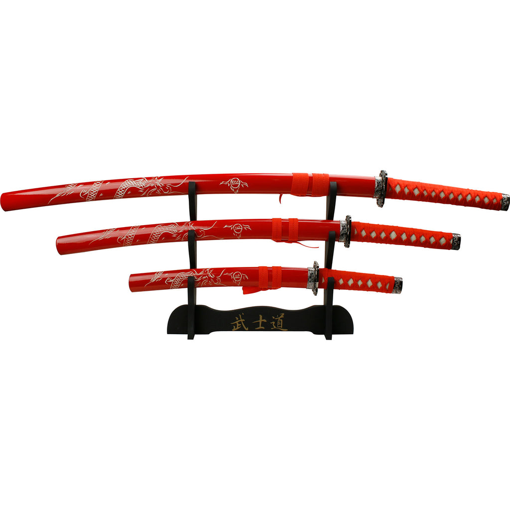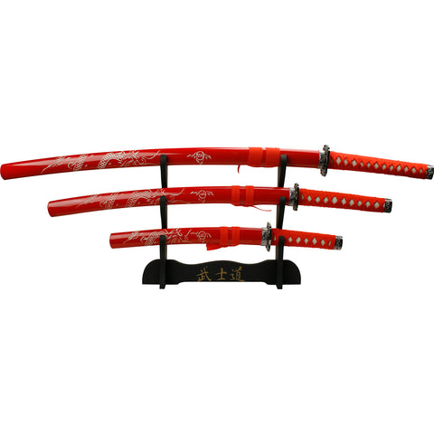 Samurai Sword 3-Piece Set with Display Stand – Red Dragon Edition
