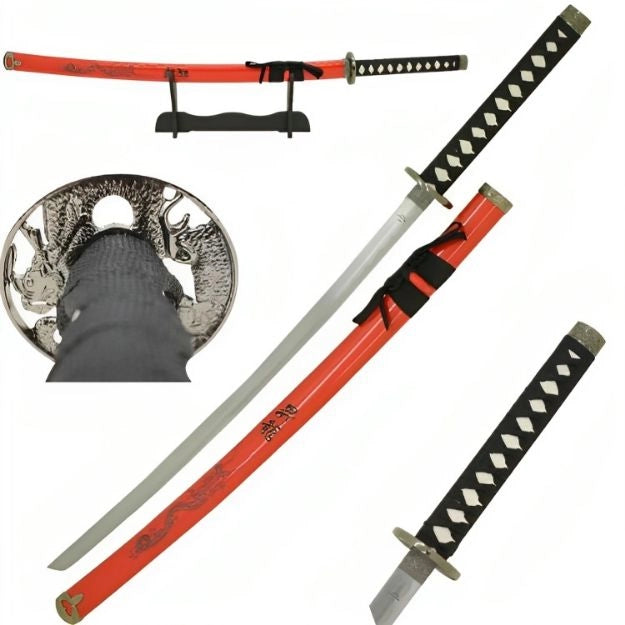 This 40-inch Samurai sword features a 26-inch blade crafted from durable 440 stainless steel, ensuring long-lasting sharpness and resilience. The handle is wrapped in cotton silk over hardwood for a secure and comfortable grip. A deluxe hardwood scabbard offers both protection and elegance, complemented by a detailed dragon design tsuba that showcases expert craftsmanship and traditional artistry. Ideal for collectors and enthusiasts seeking an authentic, well-balanced blade.