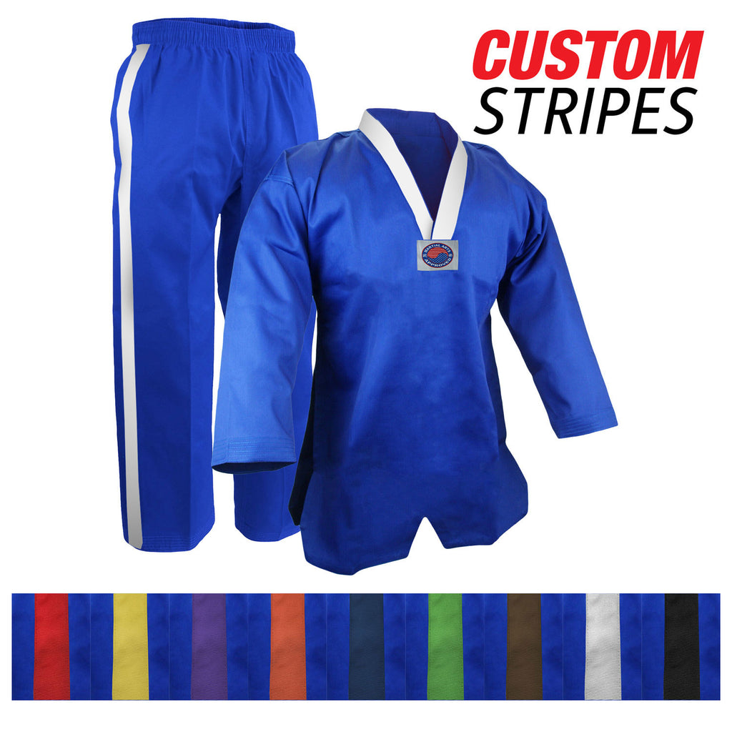 Crafted from a cotton poly blend material, this uniform is designed to provide maximum comfort and flexibility while you train, so you can perform at your best. With its lightweight construction, it won't weigh you down or restrict your movements, allowing you to focus on perfecting your technique. The V-neck design of the top is not only stylish, but it also allows for increased breathability and ventilation, keeping you cool and comfortable during intense training sessions. The Elastic pants provide comfortable fit.